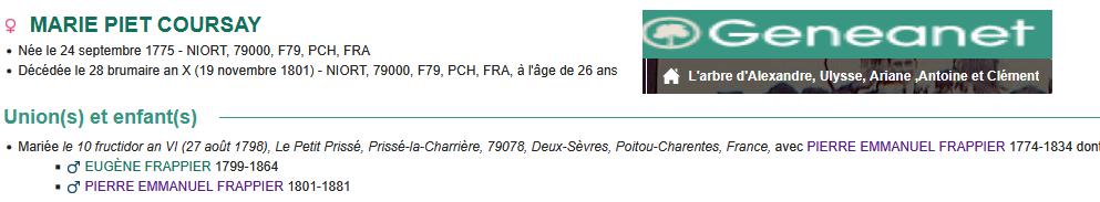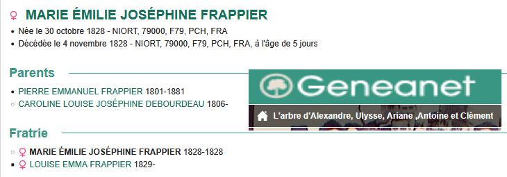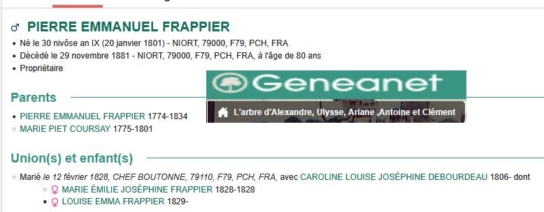… .. .. MARIE .. CO.. 1775 – 18.. – PIERRE EMMANUEL FRAPPIER DE LAPOYRAUDIERE 1801 – 1881 – MARIE EMILE JOSEPHINE FRAPPIER 30 8BRE 1828 – 4 9BRE 1828 -- |