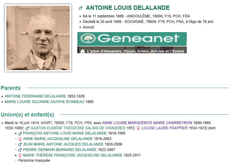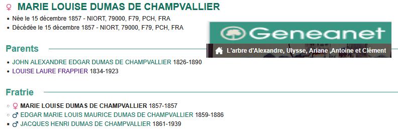 + 1802 -1870 AUGUSTINE AIMEE VIRGINIE PERREAU 1811 – 1843 – MARIE LOUISE DUMAS DE CHAMPVALLIER NEE ET DECEDEE LE 15 XBRE 1857 – NE LE 23 9BRE 1832 DECEDE LE 27 FEVRIER 1895 – 4 SEPTEMBRE 1836 - 14 FEVRIER 1924 – MARIE DELALANDE NEE CHARREYON 6 JUILLET 1890 - 24 JUIN 1965 – LOUIS DELALANDE 11 SEPTEMBRE 1889 - 20 AVRIL 1968 |