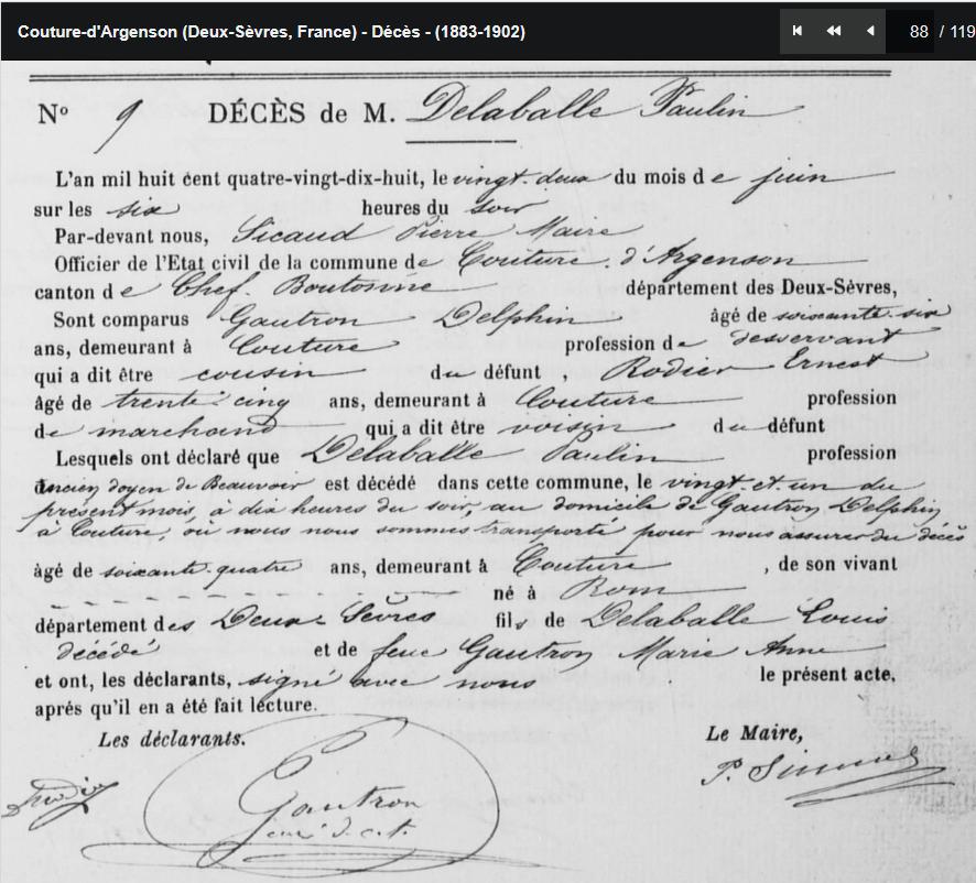 DCD le 21/06/1898 à COUTURE au domicile de son cousin GAUTRON Delphin desservant de COUTURE |