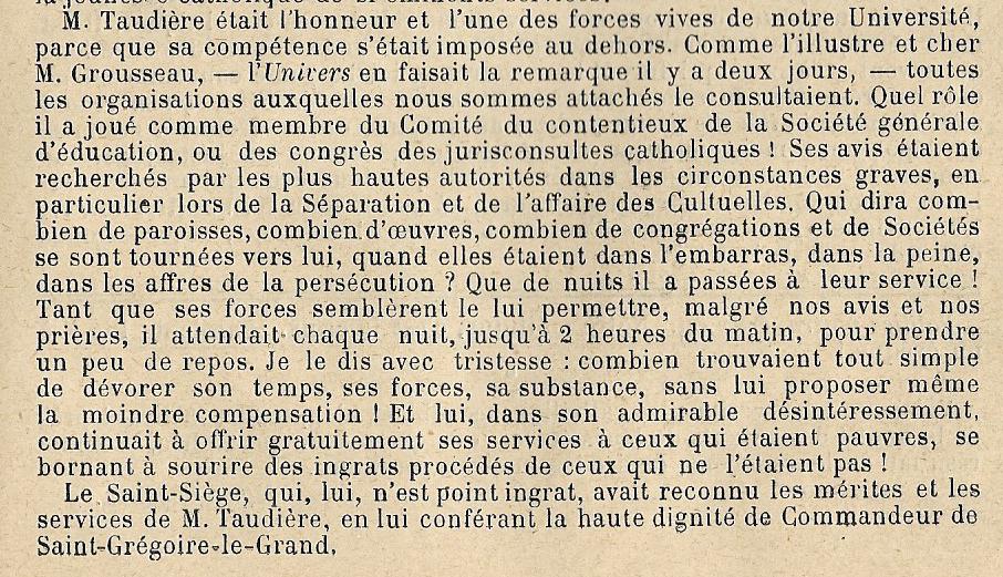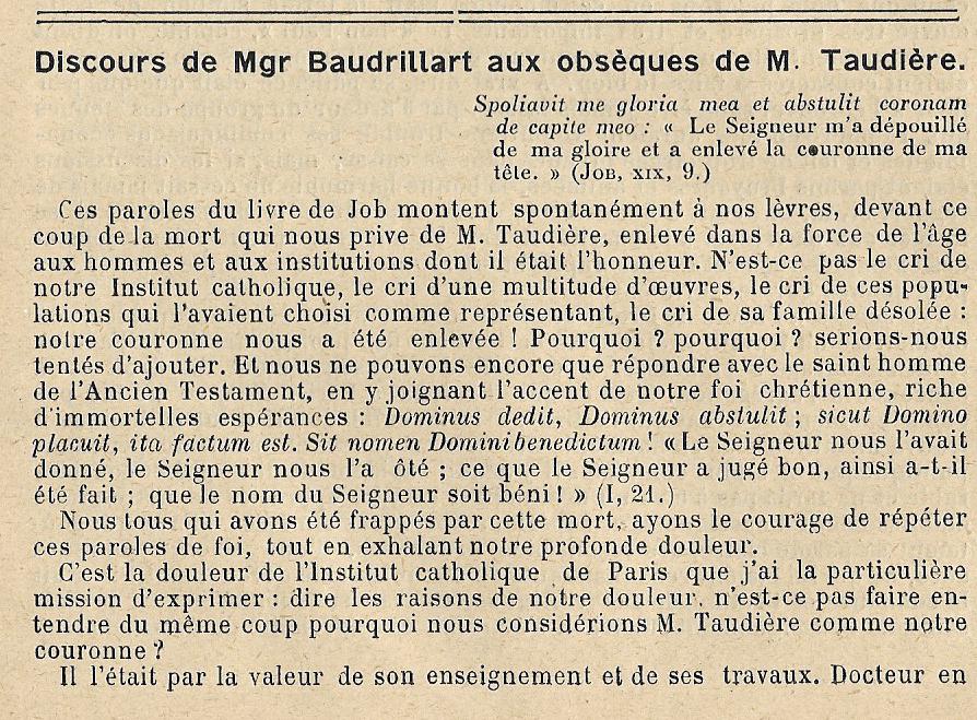 Marié le 25 mai 1857, Meaux, 77100, avec Marie Victoire Laure GUERIN 1837-1903 (Parents : Michel Jacques GUERIN 1806-1869 & Antoinette Victoire CHOISELAT 1814-1900) dont F Marie Mathilde Victoire TAUDIERE 1858- Mariée le 30 septembre 1878, Parthenay (Deux-Sèvres), avec Georges Joseph Edmond BRILLAUD ca 1850- H Jacques Henri TAUDIERE 1860-1914 Marié le 24 avril 1900, Paris, avec Emilie BRY ca 1875- F Joseph-Anne Elisabeth Pauline TAUDIERE 1872-