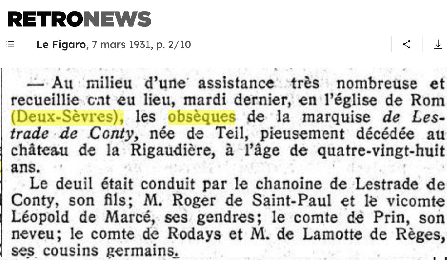 + ICI Repose dans la paix du Seigneur Léonie LECOMTE De TEIL épouse de François Edmond Marquise de LESTRADE de CONTY pieusement décédé à Rom au château de la Rigaudière le 28 Février 1931 dans sa 89e année
