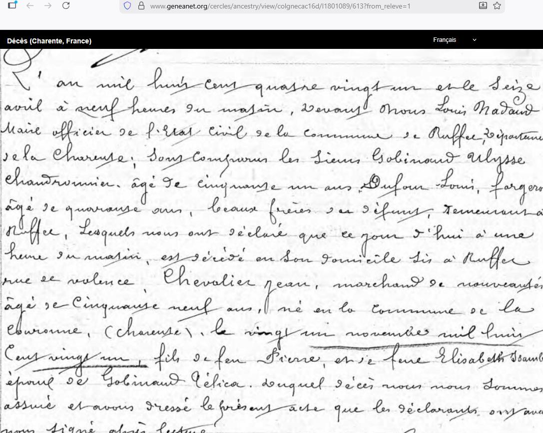 59 ans né le 21/11/1821 à LA COURONNE (16) |