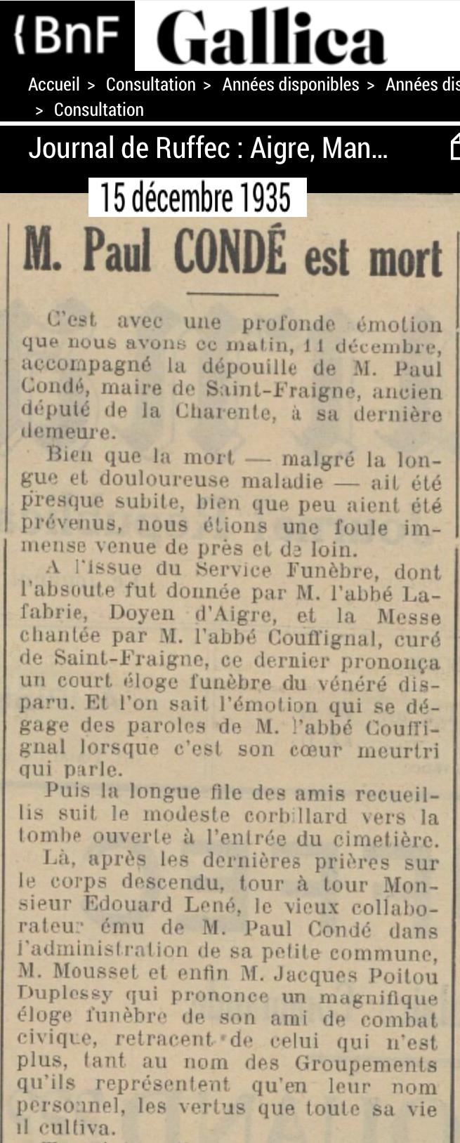 73 ans née à PARIS ?? domiciliée à Montecarlo (Monaco) veuve DCD à Biarge chez sa fille témoin : son fils MAUSELIN Emmanuel sans profession domicilié à PARIS son gendre : CONDE Paul maire de SAINT FRAIGNE |