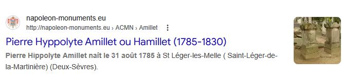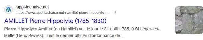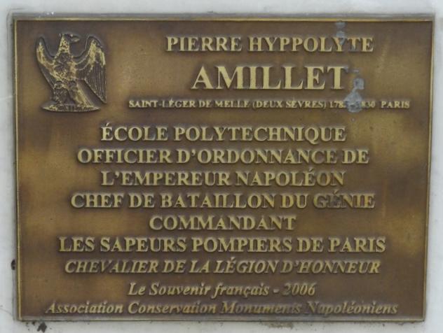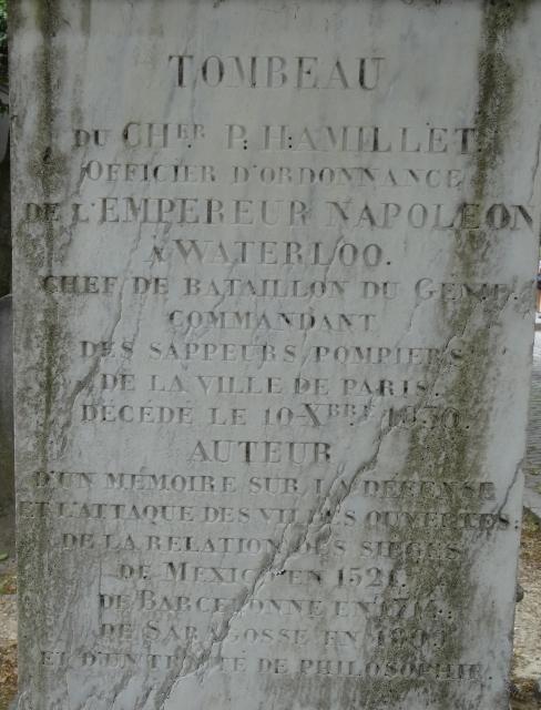 TOMBEAU DU CHER P. H. AMILLET OFFICIER D'ORDONNANCE DE L'EMPEREURNAPOLEON A WATERLOO. CHEF DE BAITAILLON DU GENIE COMMANDANT DES SAPEURS-POMPIERS DE LA VILLE DE PARIS DECEDE LE 10 XBRE 1830 AUTEUR D'UN MEMOIRE SUR LA DEFENSE ET L'ATTAQUE DES VILLES OUVERTES DE LA RELATION DES SIEGES DE MEXICO EN 1521 DE BARCELONNE EN 1714 DE SARAGOSSE EN 1809 ET D'UN TRAITE DE PHILOSOPHIE.
