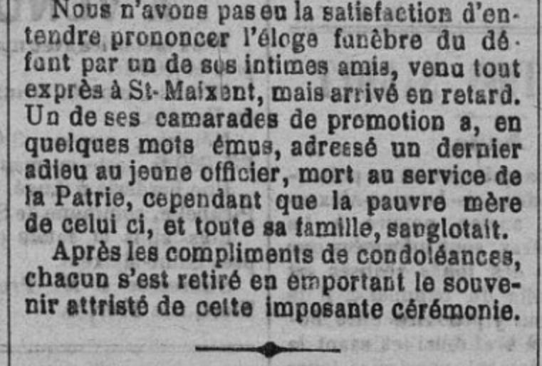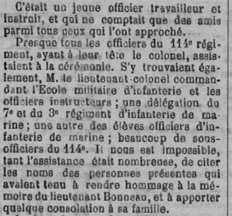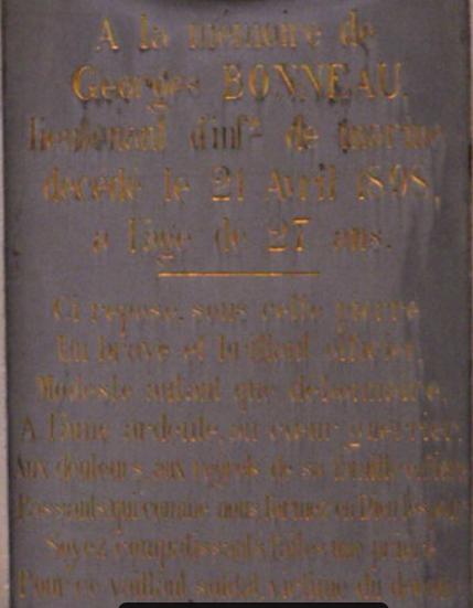 A la mémoire de Georges BONNEAU lieutenant d'infanterie de marine décédé le 21 Avril 1898 à l'âge de 27 ans – Ci repose spis cette pierre un brave .. Modeste … Aux douleurs aux regrets de sa famille .. Passants qui .. .. Pour ce vaillant soldat .. |