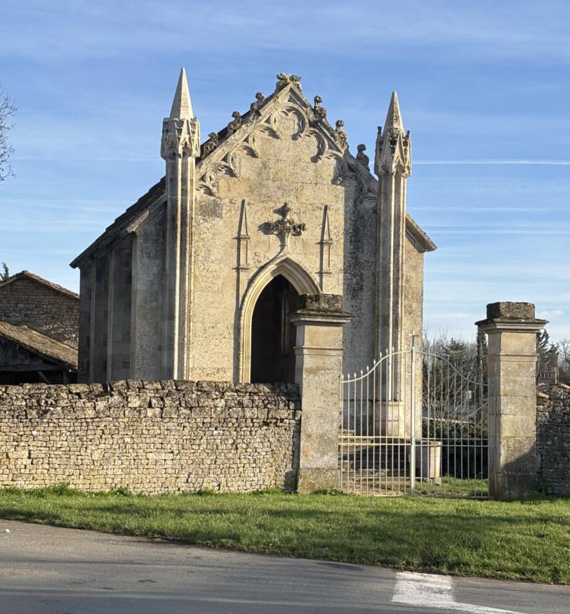 Extrait Base Mérimée « en 1842 la veuve de Louis Charles Auguste Prevost fait édifier une chapelle funéraire à la mémoire de son mari, dédiée à saint Louis et saint Augustin, cette chapelle est construite par Jean Dulin architecte départemental de la Vienne, des 1848 le service de cette chapelle est rattaché à la cure de Saint-Romans-lès-Melle et une messe dominicale y est célébrée » » |