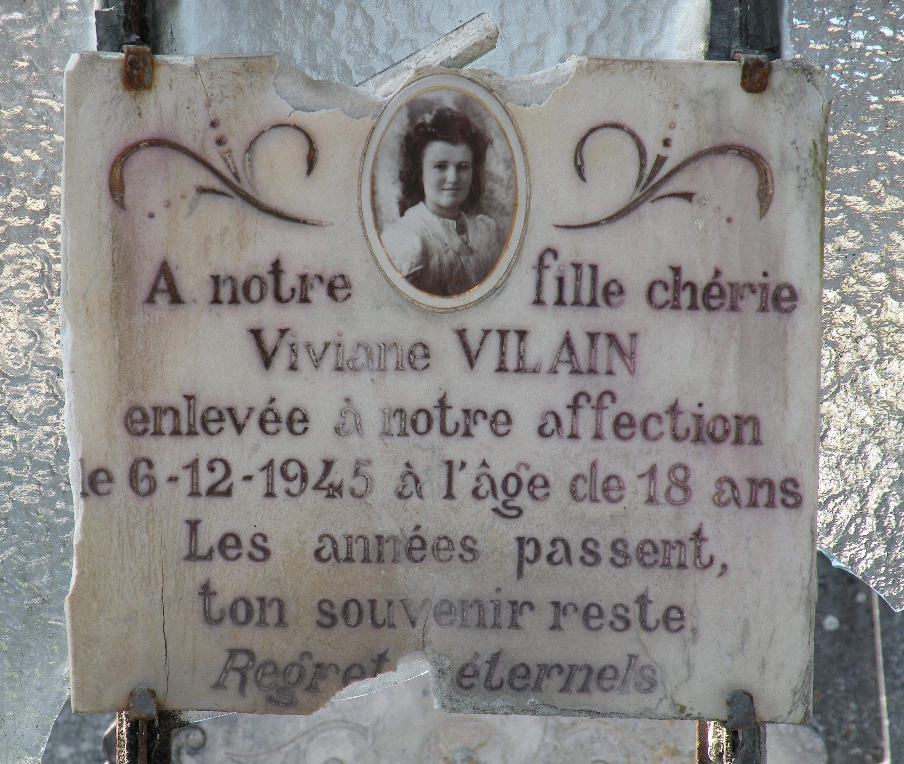 A notre fille chérie Viviane VILAIN enlevée à notre affection le 6-12-1945 à l'âge de 18 ans Les années passent ton souvenir reste Regrets éternels |