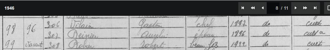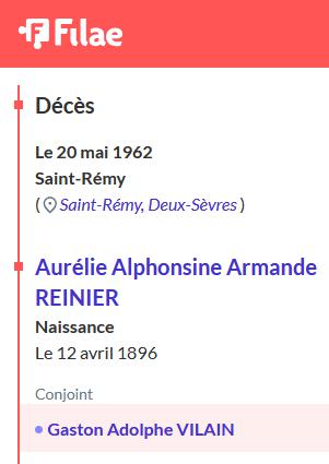 A été mariée un an entre 1921 et 1922 avec ROBIER Edmond (DCD en 1922) s'est remariée le 23/01/1926 avec VILAIN Gaston |