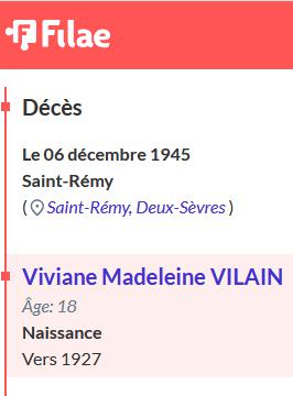Vivianne VILAIN était l'enfant unique du couple VILAIN/REINIER (un couple de veufs) Elle avait un demi-frère |