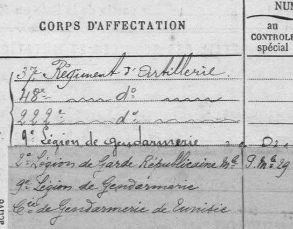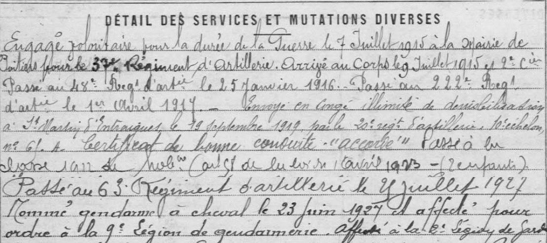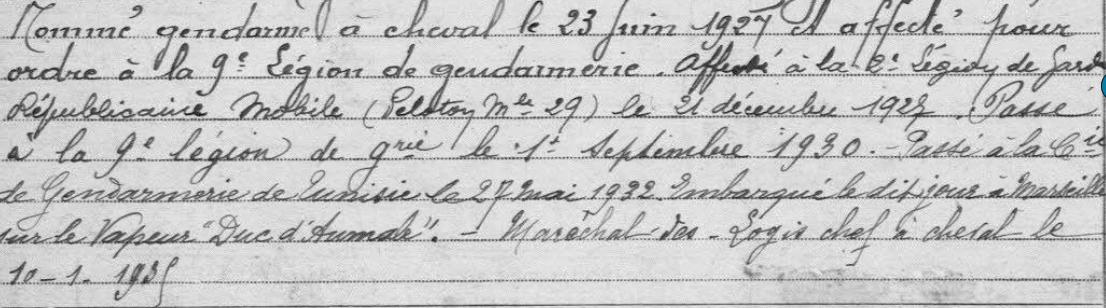 Gendarme en 1927, sera nommé en Tunisie en 1932, Maréchal des Logis en 1935 Fera toute sa carrière en Tunisie. Habitera pour sa retraite, rue de la gaité, en face de l'école à St Romans