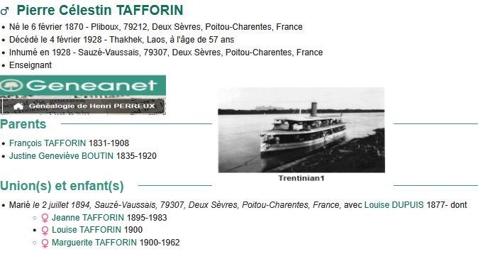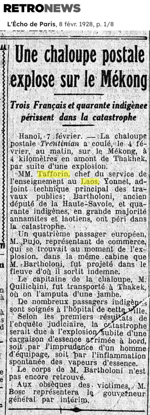 TAFFORIN Pierre chef du service de l'enseignement au LAOS DCD le 04 février 1928 au LAOS suite naufrage consécutif à une explosion du bateau qui le transportait vers Vientiane
