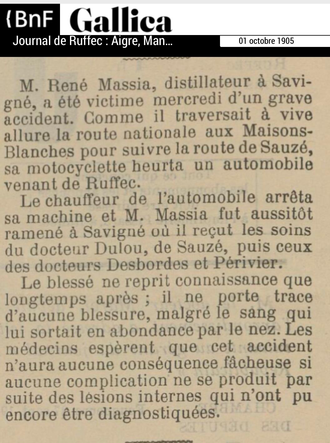 René MASSIA industriel à SAVIGNE Union(s) et enfant(s) Marié avec Marie RASSAT dont H Maurice René -Gustave MASSIA 1896