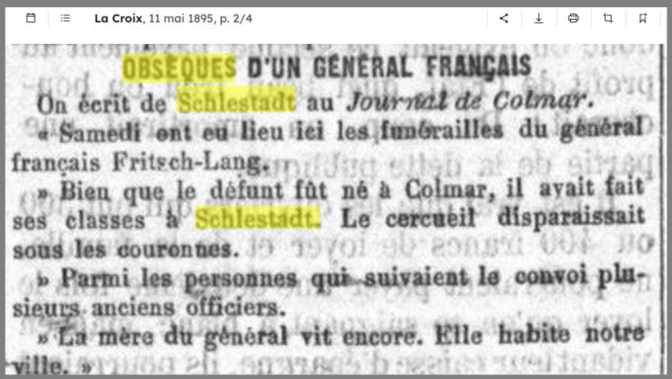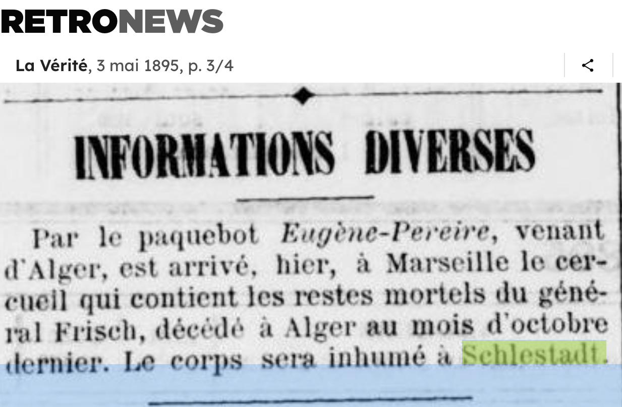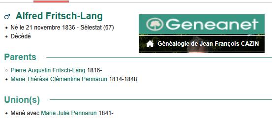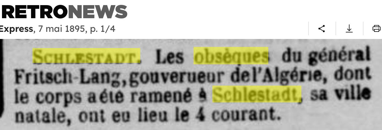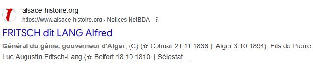 FRITSCH dit LANG AlfredGénéral du génie, gouverneur d’Alger, (C) (★ Colmar 21.11.1836 † Alger 3.10.1894). Fils de Pierre Luc Augustin Fritsch-Lang (★ Belfort 18.10.1810 † Sélestat 4.10.1874), négociant en vins, et de Marie Thérèse Pennarum (★ Sélestat 12.7.1814 † id. 6.8.1843), fille de Joseph Roland Pennarum (★ Rosporden, Finistère, 27.2.1773 † 6.9.1836), avocat au tribunal civil de Sélestat, adjoint au maire, ∞ 23.12.1863 à Sélestat sa cousine germaine Marie Julie Pennarum (★ Sélestat 18.8.1841 † Nice 27.3.1889), fille de Joseph Benjamin Pennarum ©, et d’Élisabeth Sophie dit Lang (★ Belfort 1813 † Sélestat 1883) ; sans enfant. Fritsch-Lang passa son enfance et sa jeunesse à Sélestat. Après de bonnes études au collège, il entra à l’école Polytechnique (1er septembre 1855) puis à celle d’application de Metz qu’il quitta pour l’arme du génie dans laquelle il fit toute sa carrière. Le 14 décembre 1862, il fut professeur adjoint du cours des fortifications à Saint-Cyr. Il était capitaine d’état- major, détaché à Langres en 1863. Le 21 août 1870 il fut affecté au 3e régiment du Génie de l’Armée du Rhin et participa au combat de Mouzon, Vouzy et Sedan, fut fait prisonnier et interné à Erfurt du 3 septembre au 24 avril 1871. Le 1er juillet 1871 il rejoignit l’état-major de l’armée de Versailles. Comme beaucoup de ses compatriotes, il demanda à servir en Algérie, où il accomplit la plus grande partie de sa carrière. Successivement chef bataillon le 18 septembre 1875, lieutenant-colonel le 7 novembre 1882 et colonel le 27 juillet 1887, il fut promu général de brigade le 18 mars 1893 et pourvu en même temps de la charge de gouverneur d’Alger. Officier de la Légion d’honneur. Archives historiques de l’Armée, IIIe série, dossier 473 ; Archives municipales Sélestat, état-civil, mariage 1863, État signalétique et de service ; Elsässische Nachrichten du 7.5.1895 ; Dictionnaire de biographie française, XIV, 1979, 1311. † Alphonse Halter et Maurice Kubler (1988)