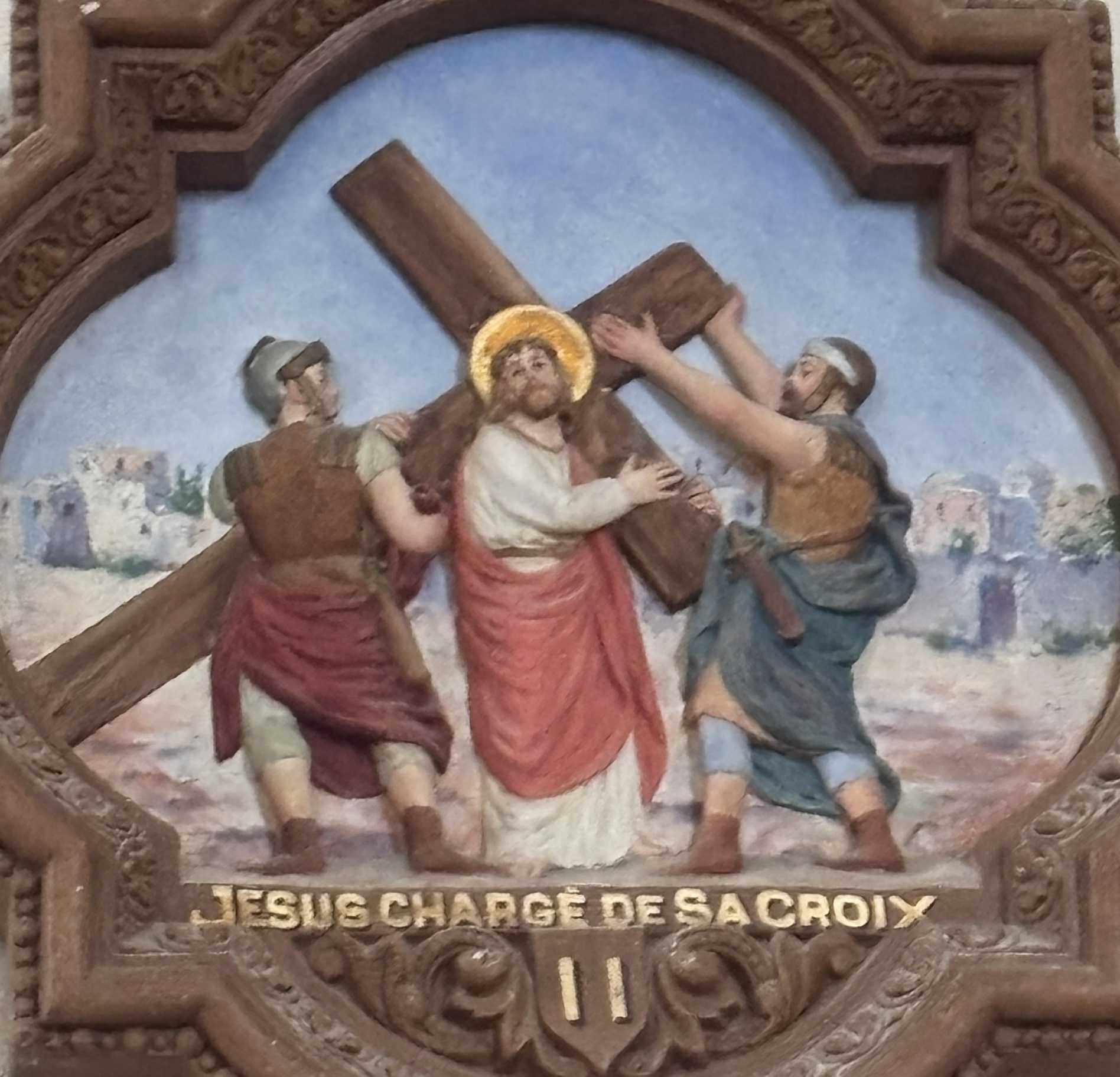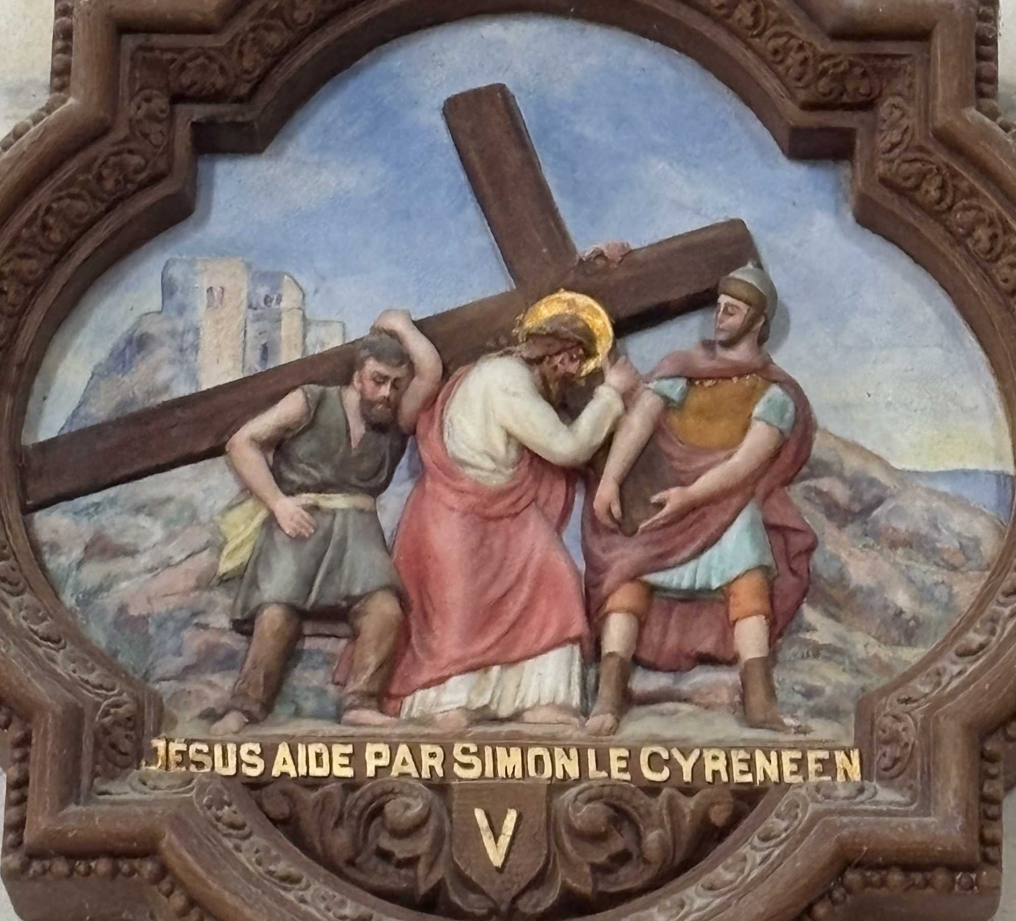 5e station : Simon de Cyrène aide Jésus à porter sa croix. |