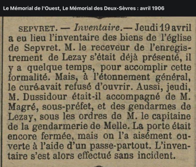 La verrière de sainte Catherine est cassée en deux et a été déposée et mise au rebut derrière l'autel Ces verrières ont été offertes par Ernestine Fouquet, veuve du lieutenant colonel Adam, demeurant à Faugerit (commune de Sepvret) qui fit revendiquer la proprieté de la totalité du mobilier (par l'intermédiaire du curé de la paroisse) au moment de l'inventaire de 1906 (la Semaine religieuse du diocèse de Poitiers, 1905, p. 530, 1906, p. 321) |