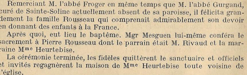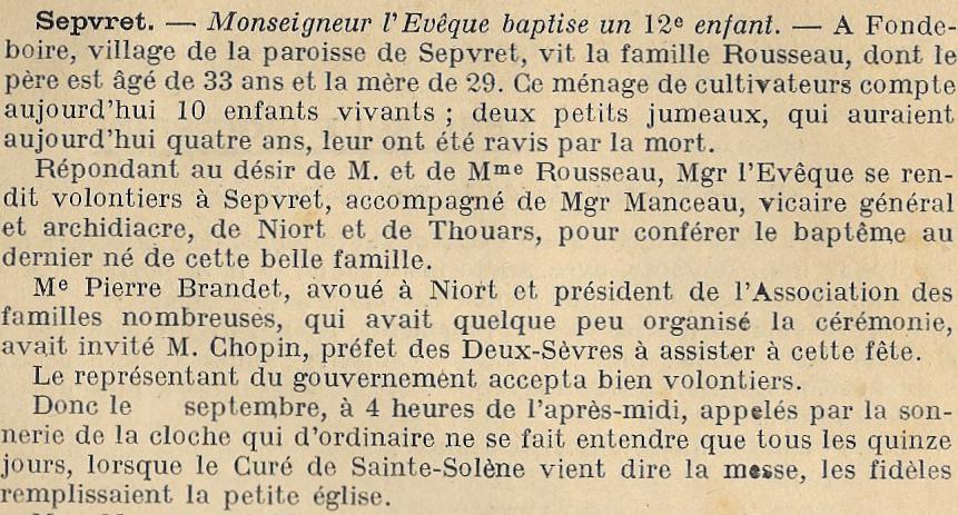 Inscription et date sur quatre lignes avec deux mains initiales : L'AN 1866 PIE IX S.PONTIFE L.E.PIE EVEQUE DE POITIERS NAPOLEON III EMPEREUR J'AI ETE/BAPTISEE PAR MR BONIN CURE DE SEPVRET ET NOMMEE MARTIN J'AI POUR PARRAIN ET/MARRAINE ET DONATEURS MR JB EDGARD GABORIT DE MONTJON DE BONNEVAUX ET MLLE FRANCOISE/ANTOINETTE ANGADESME ISORE D'HERVAULT DE PLEUMARTIN ; marque d'auteur au bas de la faussure : BOLLEE PERE ET FILS FONDEURS ACCORDEURS AU MANS La cloche fut bénite le 23 juillet 1866 (Berthelé Joseph : enquêtes campanaires, p. 200-201) |