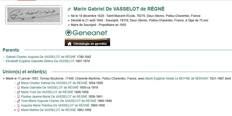 ELISABETH GABRIELLE SELIMA DE VASSELOT DE LA CHENAYE Marquise DE VASSELOT DE REGNE 1807 – 1979 – Mlle MARIA DE VASSELOT DE REGNE 1839 – 1909 – ARMAND DE VASSELOT DE REGNE 1900 – 1909 – JOSEPH MARIE ROGER Comte R DE VASSELOT DE REGNE 1901 – 1929 – FRANCOIS MARIE GASTON MICHEL DE VASSELOT DE REGNE 27 MAI – 16 AOÛT 1943 – PAULE JEANNE MARIE DE VASSELOT DE REGNE 1858 – 1951 – ANNE L... M.... PORET DE Comtesse R DE 18 .. -.... – CHANT.. DE … Comtesse G DE VASSELOT DEREGNE 1891 - 1982