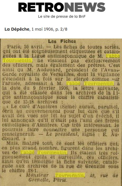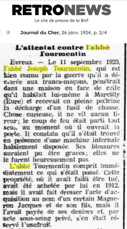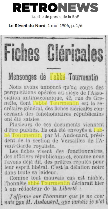 « « « J. Tourmentin, de son vrai nom Henry-Stanislas-Athanase Joseph, né le 5 novembre 1850 à Champdeniers et mort le 27 novembre 1931 à Sainte-Pezenne, est un religieux et auteur antimaçonnique français. Ordonné prêtre dans le diocèse de Poitiers, Henry Joseph devient successivement professeur à Arcachon, puis journaliste à Paris, où, sous le nom de plume de J. Tourmentin (en référence au tourmentin)[réf. nécessaire], il se spécialise dans l'antimaçonnisme. Il utilise également d'autres pseudonymes (Josepff, Misaine, Joseph de Villemont)1. En 1897, il est l'un des fondateurs du Comité Antimaçonnique de Paris, qui prend en 1904 le nom d'Association antimaçonnique de France (quelquefois appelée, à tort, « Ligue antimaçonnique de France »)2, dont il assure le secrétariat général et dont il dirige le Bulletin. » » » »