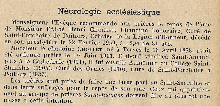 LE BON PASTEUR DONNE SA VIE POUR SES BREBIS MONSIEUR LE CHANOINE HENRI CHOLLET CURE DES ORMES 1910-1936 – de ST PORCHAIRE DE POITIERS 1936-1959 OFFICIER DE LA LEGION D'HONNEUR RAPPELE A DIEU LE 22 FEVRIER 1959 DANS SA 8. EME ANNEE PRIEZ DIEU POUR LUI |