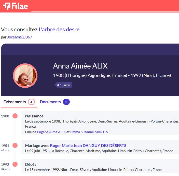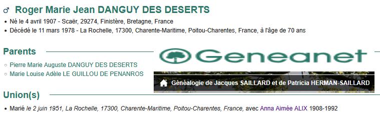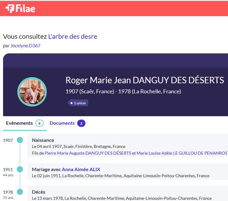 ROGER DANGUY DES DESERTS 1907 – 1978 ANNA ALIX EPOUSE DANGUY DES DESERTS 1908 - 1922 |