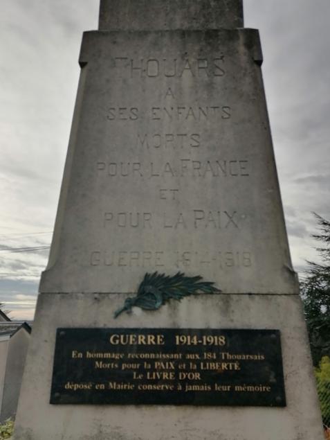 "Guerre 1914-1918 En hommage reconnaissant aux 181 thouarsais morts pour la paix et la liberté - Le livre d'or déposé en mairie conserve à jamais leur mémoire" |