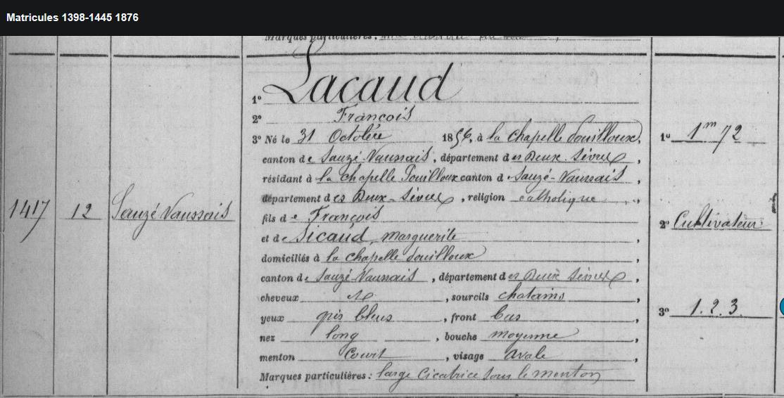 LACAUD François né le 31/10/1856 à LA CHAPELLE POUILLOUX fils de François LACAUD et de SIRAUD Marguerite |