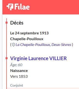 VILLIER Virginie DCD le 25/09/1913 à LA CHAPELLE POUILLOUX (79) LACAUD François, rentier DCD le 25/12/1919 à LA CHAPELLE POUILLOUX (79) |