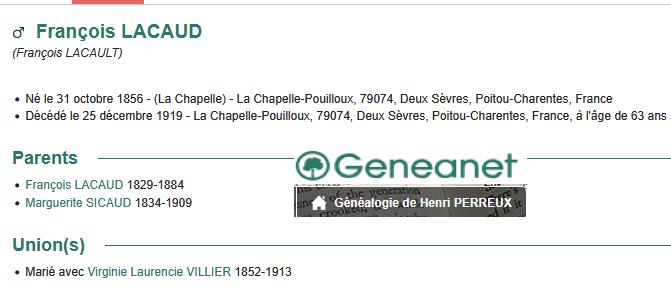 LACAUD François né le 31/10/1856 à LA CHAPELLE POUILLOUX (79) fils de feu LACAUD François et de SICAUD Marguerite Elle marchande bouchère née le 08/10/1852 à LAVAL domiciliée à PARIS |