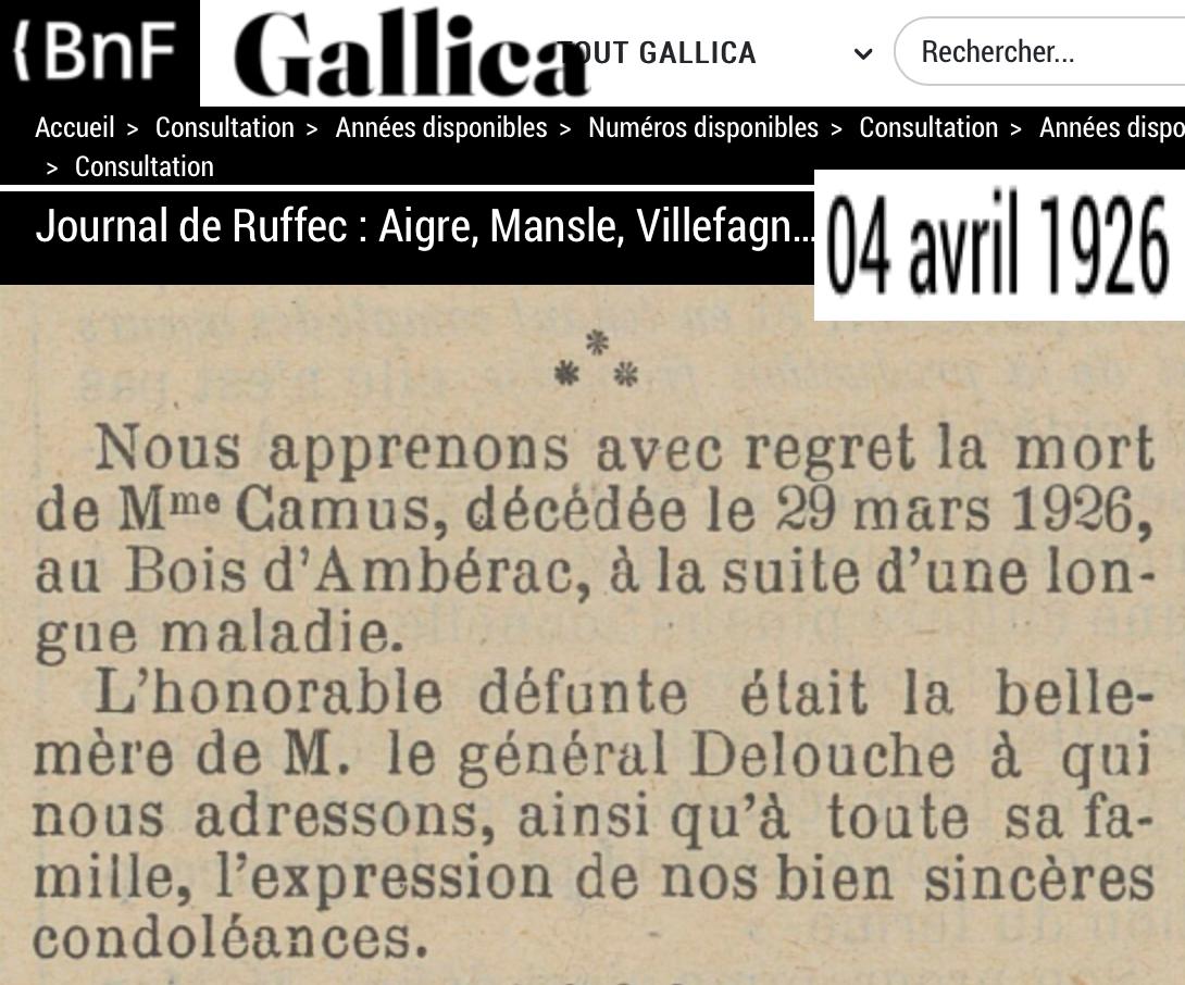Elle sans profession né à PARIS 16° le 06/06/1878 20 ans domiciliée avec ses parents à TUSSON et précédemment domiciliée à COLOMBES (Seine) fille de Marcel Victor CAMUS négociant 56 ans et de Julie Adélaïde Elise ROBERT 41 ans |