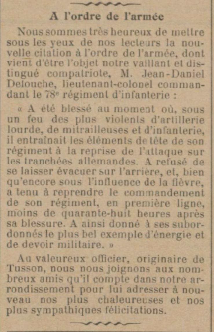 Lui né à TUSSON le 28/06/1867 31 ans veuf de Octavie Célestine Marthe EGRETAUD Capitaine aux Chasseurs à Pied détaché à l'école de Guerre à PARIS demeurant à PARIS domicilié avant à TUSSON fils de feu Jean DELOUCHE et de Adélaïde BERNARD 51 ans domiciliée à TUSSON