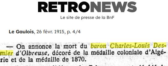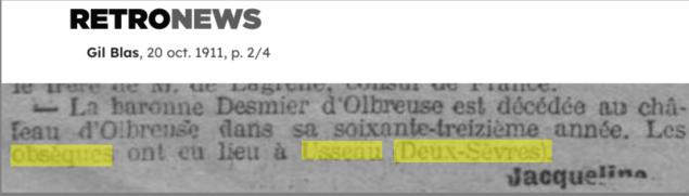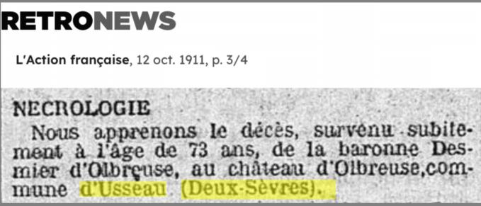 Ici reposent la Baronne Ch. DESMIER d'OLBREUSE 11 Octobre 1911 Le Baron Ch. DESMIER d'Olbreuse 2 Février 1915 Mlle Lucy DESMIER D'OBREUSE 5 Janvier 1924
