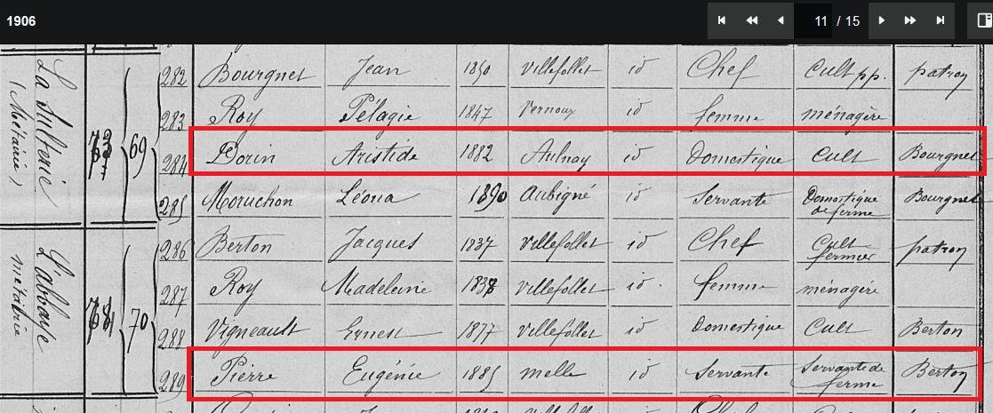 Recensement 1906 à VERNOUX SUR BOUTONNE avant leur mariage, ils sont domestiques dans deux fermes voisines |