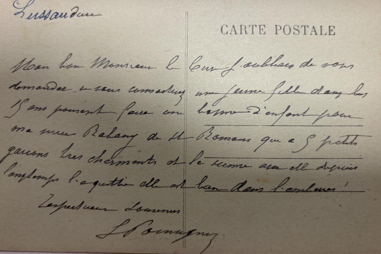 Mon bon Monsieur le Curé j'oubliais de vous demander si vous connaissiez une jeune fille dans les 15 ans pouvant faire une bonne d'enfant pour ma sœur Rabany de St Romans qui a 5 petits garçons très charmants et l... avec elle depuis longtemps … elle est bien dans l'embarras Respectueux .. L Poinsignon |