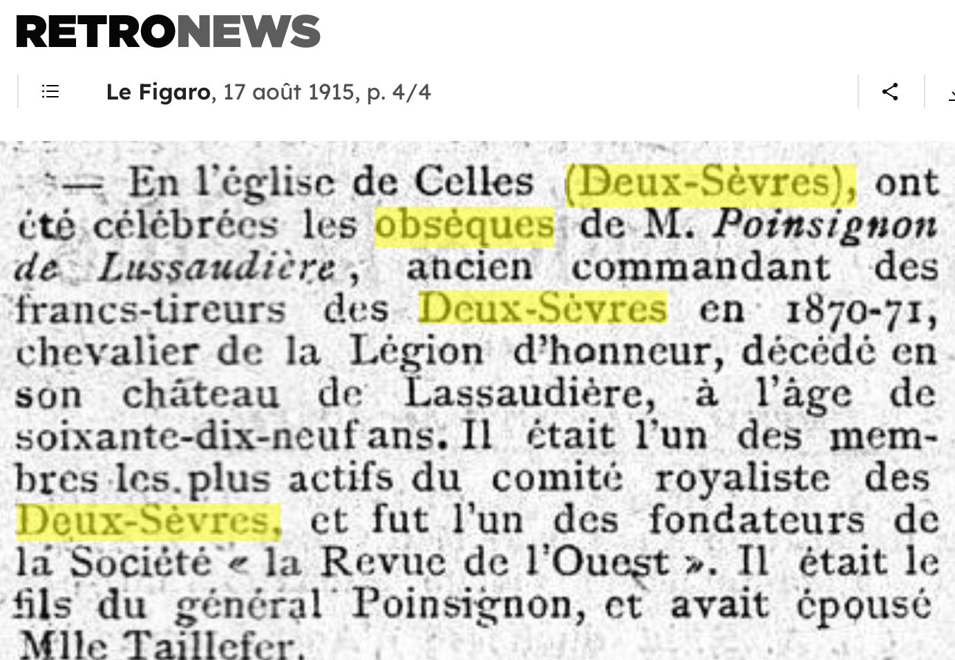 J.T.D. AUGUSTE POINSIGNON Chevalier de la Légion d'Honneur Commandant des Francs Tireurs des Deux Sèvres 1870_71 6 Août 1835 – 6 Août 1915 PRIEZ DIEU POUR LE REPOS DE SON AME