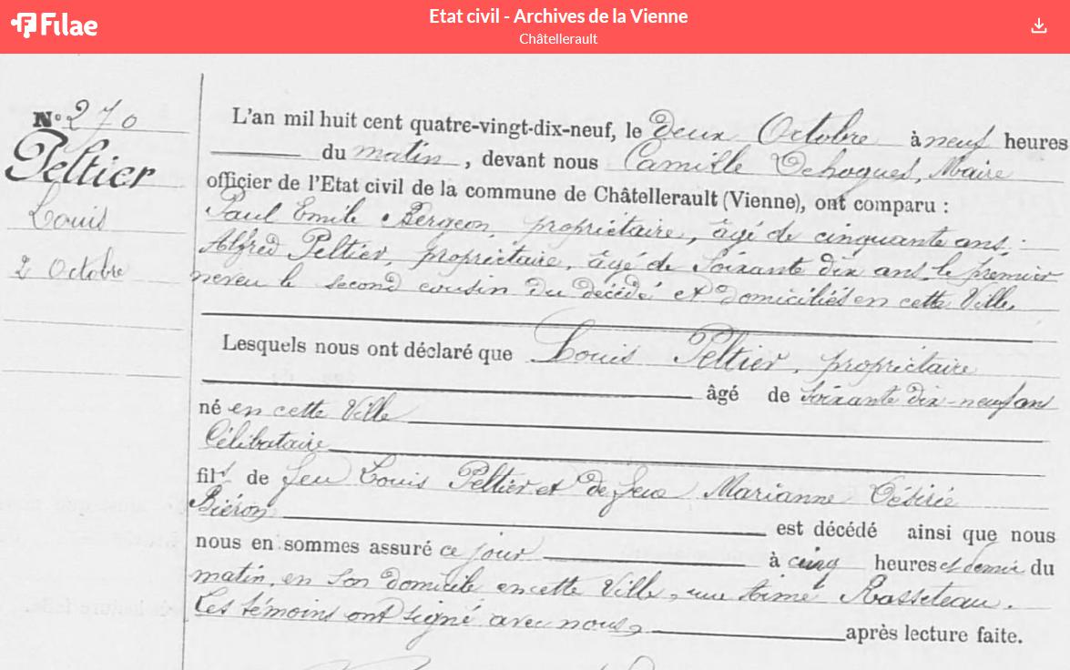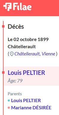 Mr Cheri PELTIER décédé à CHATELLERAULT le 2 octobre 1899 dans sa 80ème année |