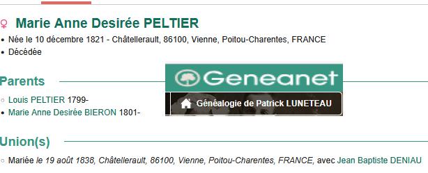 Mme Désirée DENIAU née PELTIER décédée à PARIS le 22 Septembre 1874 dans sa 52ème année |