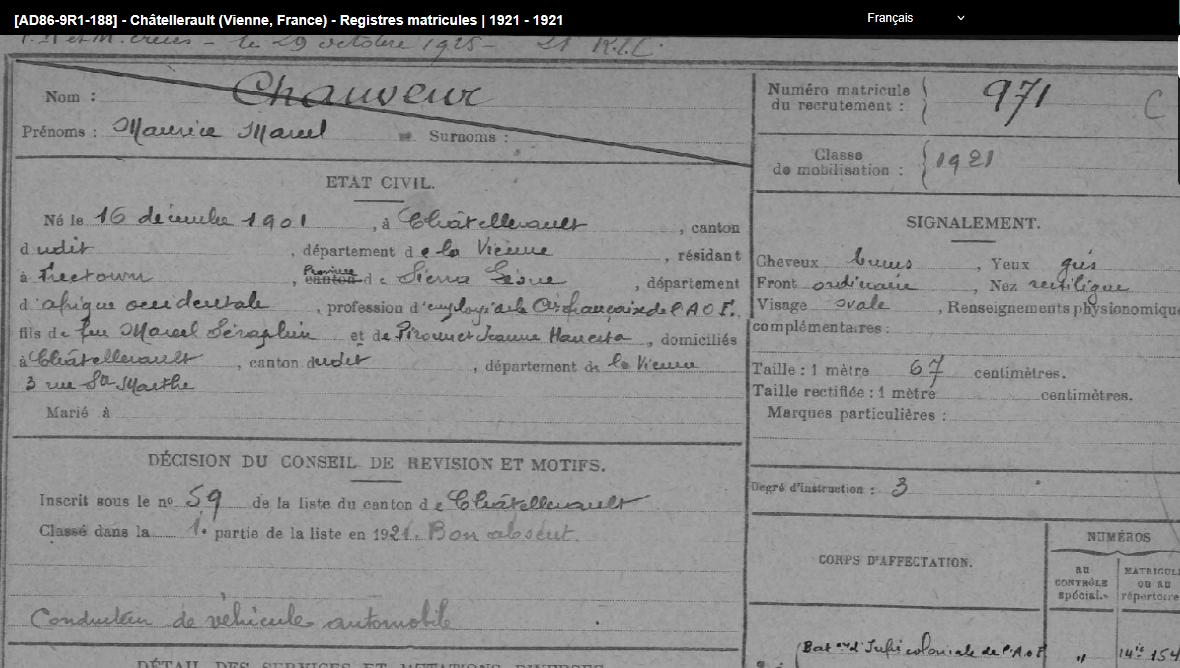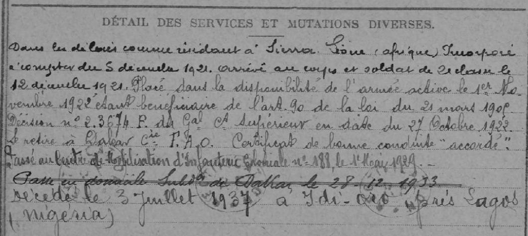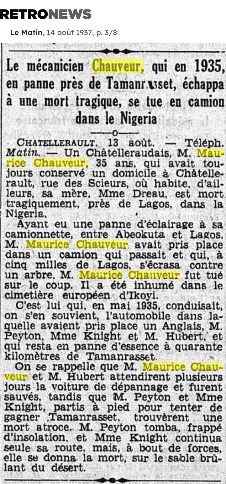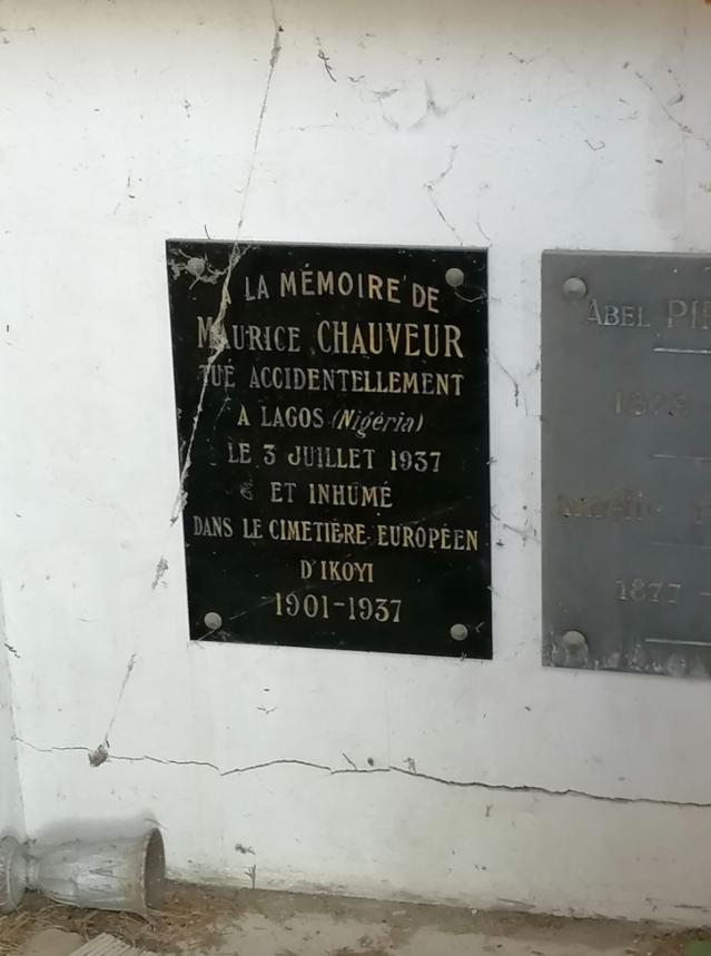 A LA MEMOIRE DE MAURICE CHAUVEUR TUE ACCIDENTELLEMENT A LAGOS (Nigéra) LE 3 JUILLET 1937 ET INHUME DANS LE CIMETIERE EUROPEEN D'IKOYI 1901 - 1937 |