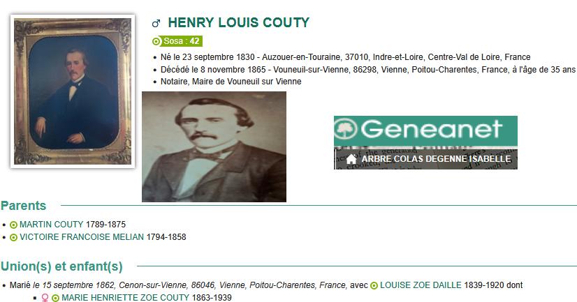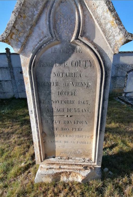 LE CORPS DE HENRI LOUIS COUTY NOTAIRE A VOUNEUIL SUR VIENNE DECEDE LE 8 NOVEMBRE 1865 A L'AGE DE 35 ANS – IL FUT BON EPOUX ET BON PERE